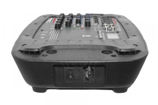 Микшерный пульт имеет 4 канала, эффект "Эхо" с возможностью регулировки его интенсивности, фантомное питание для микрофона +10 Вольт, эквалайзер с готовыми пресетами на все случаи жизни, а так же полноценный mp3 плеер, слот для карты памяти SD, Bluetooth и USB разъем.